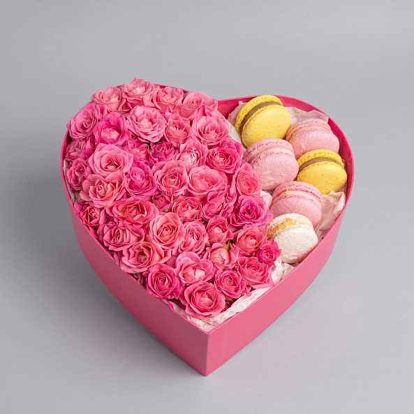 Коробка «Сердце Нежности: Кустовая Роза «Лиана» и Премиум-Макаруны»