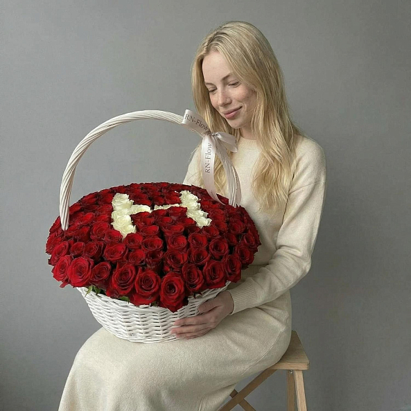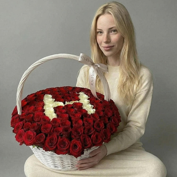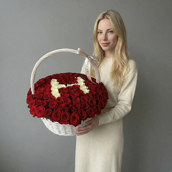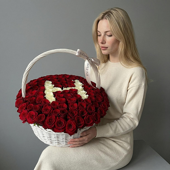 Корзина 101 Роза с Буквой. Красно-Белая.