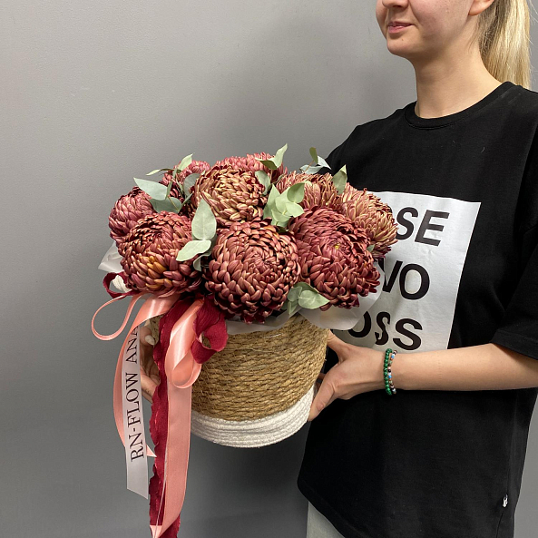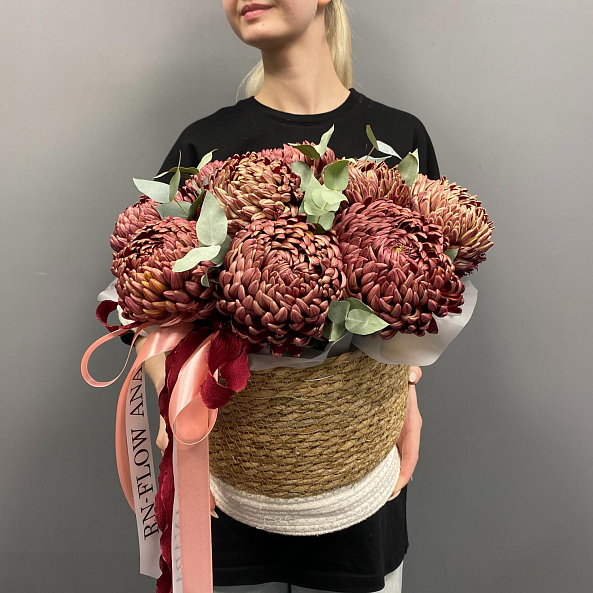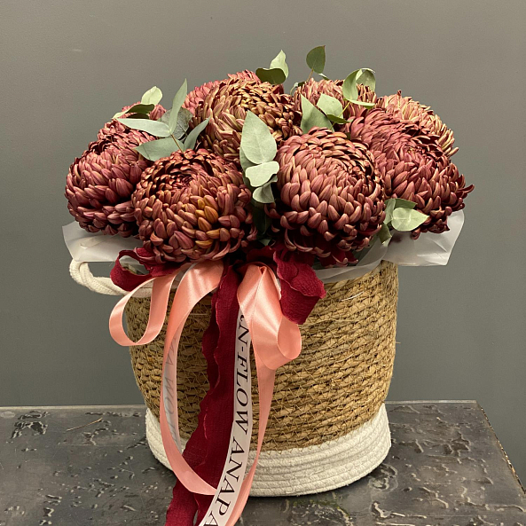Корзина «Бордовый закат» — Хризантемы + Эвкалипт