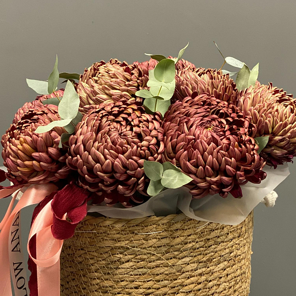 Пышные хризантемы в оттенке бордо с персиковыми нюансами и свежий эвкалипт — идеальное сочетание для подарка, который дарит тепло и настроение.