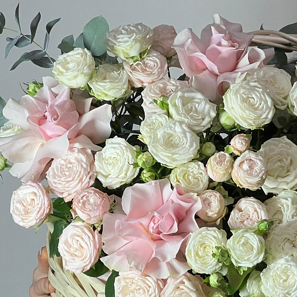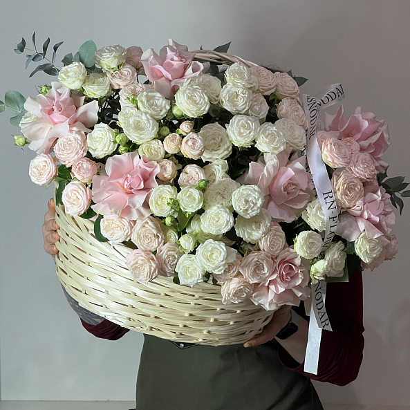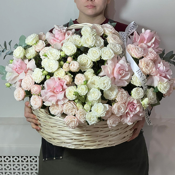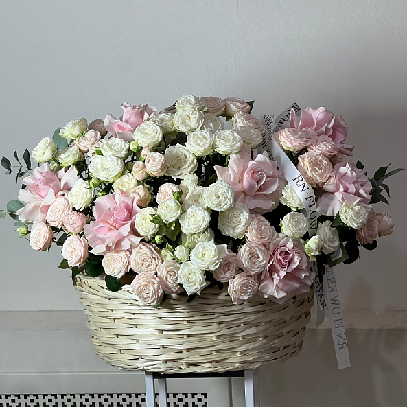 Пышная корзина из нежно-розовых и белых роз — это букет для тех, кто ценит изысканность, уют и доброту. Идеален для подарка или как украшение дома.