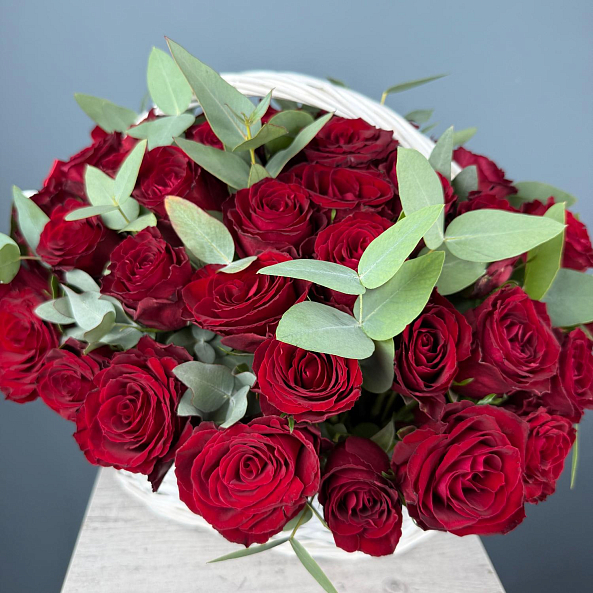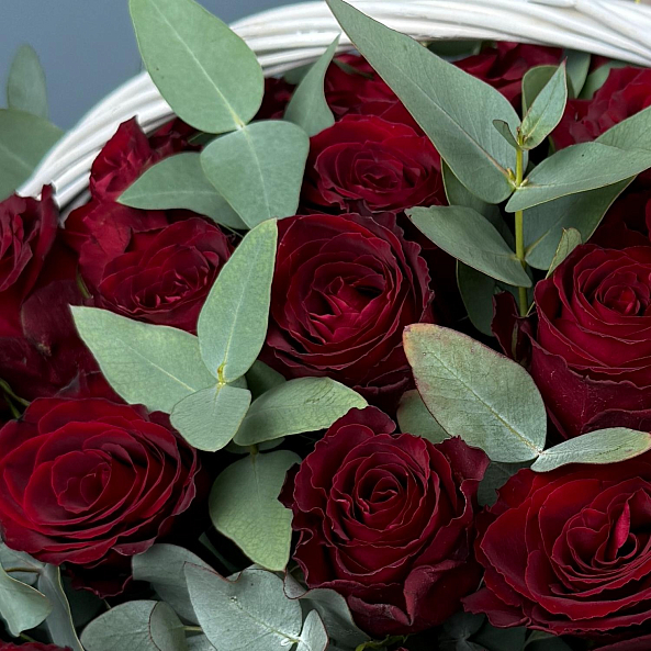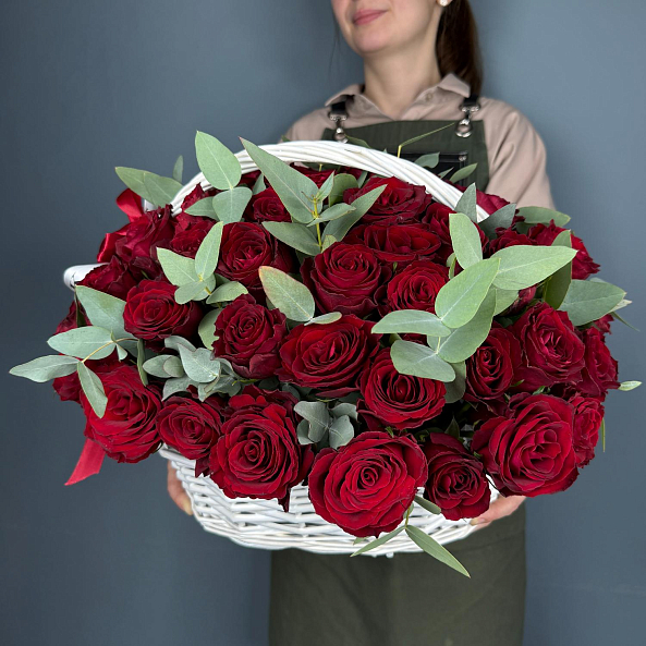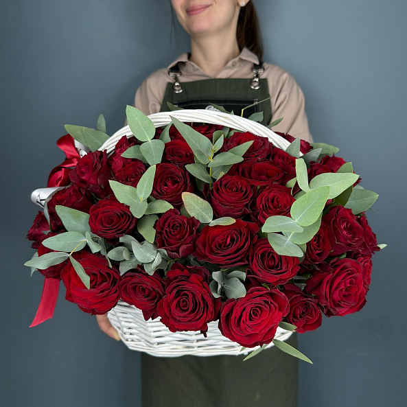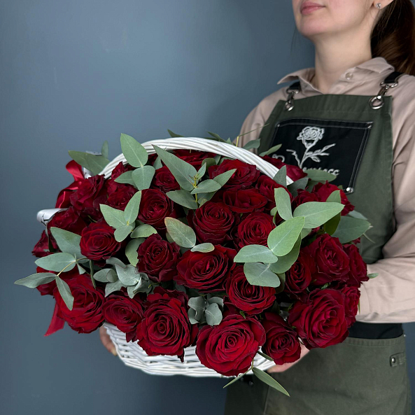 Букет из 51 красной розы в белой плетёной корзине — символ глубокой, страстной и вечной любви. Насыщенный бордовый цвет, идеальная форма бутонов и свежий эвкалипт создают роскошный, объёмный и очень романтичный образ. Идеален для самого важного признания или особенного праздника.