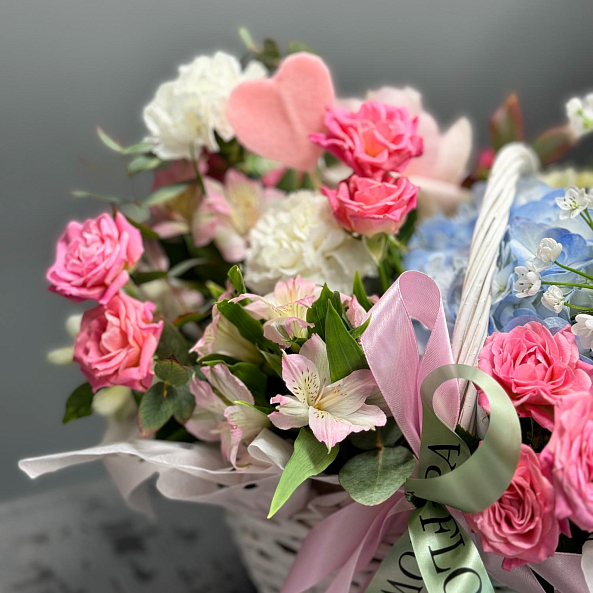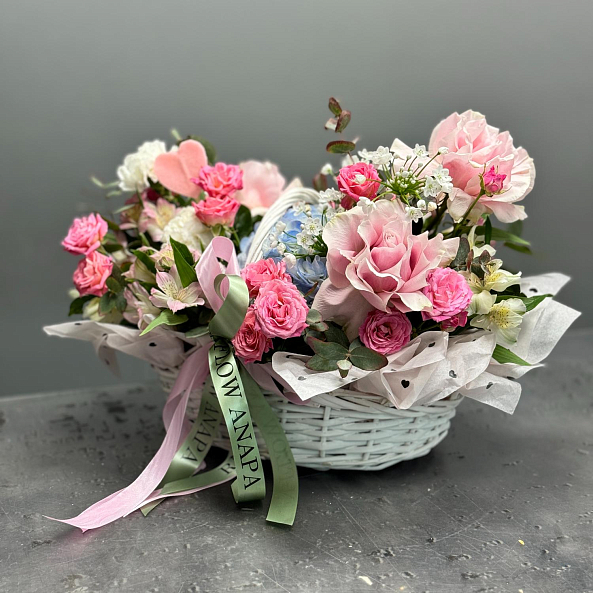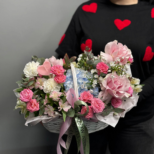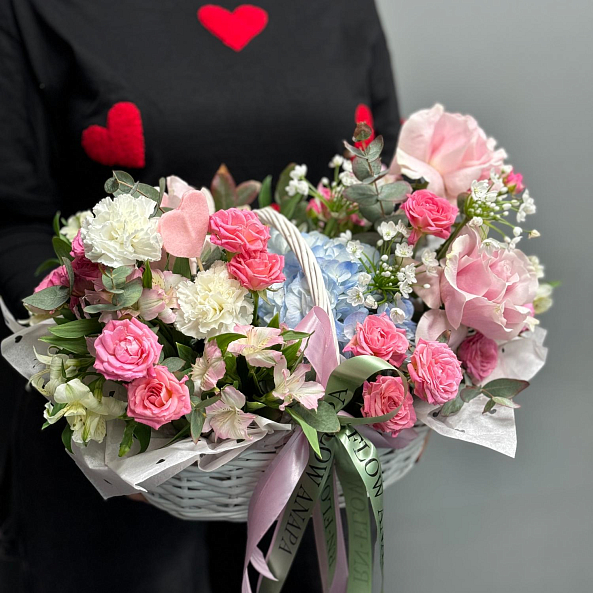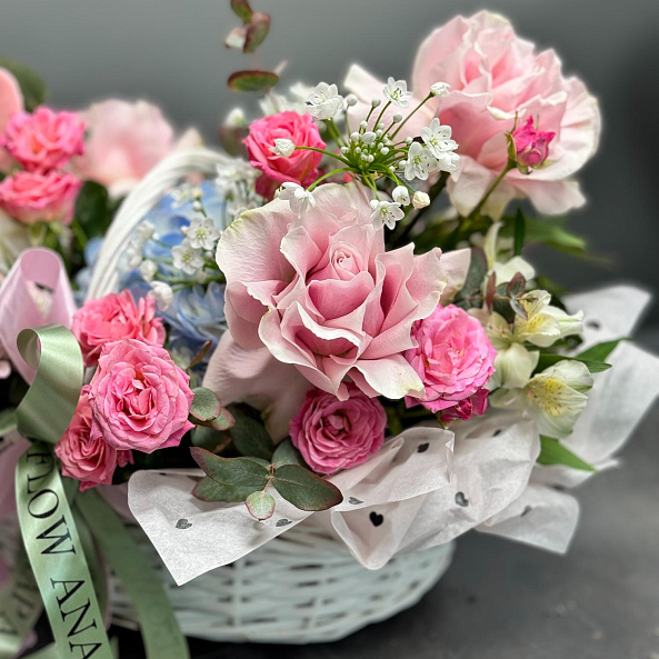 Корзина с цветами. Французская Роза, Хамелациум, Гортензия, Альстромерия, Диантус, Кустовая Роза, Эвкалипт.