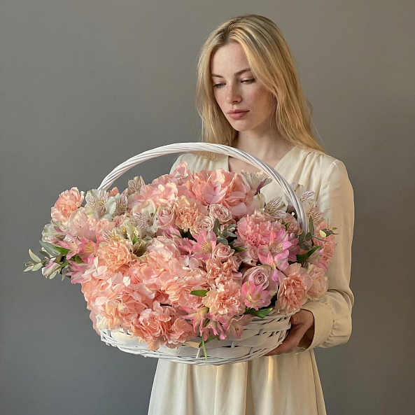 Корзина «Нежный рассвет» — Гортензия + Альстромерия + Роза + Гвоздика