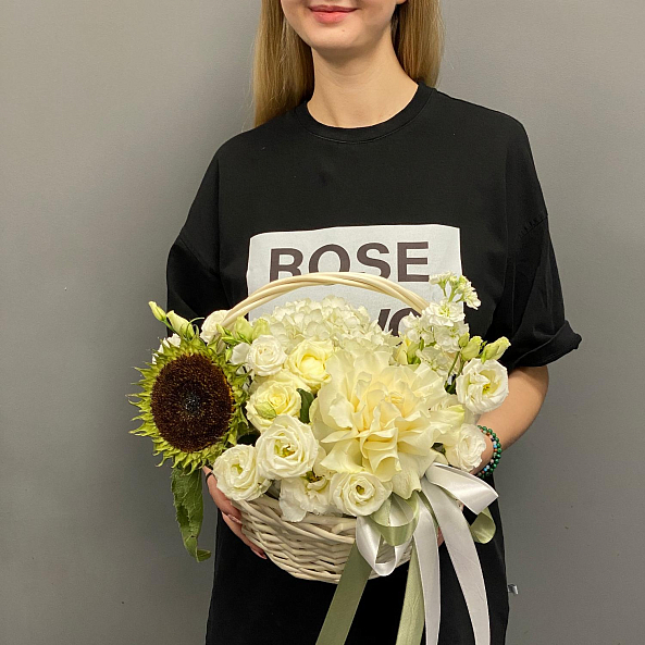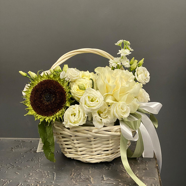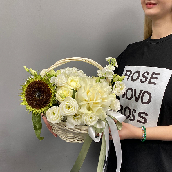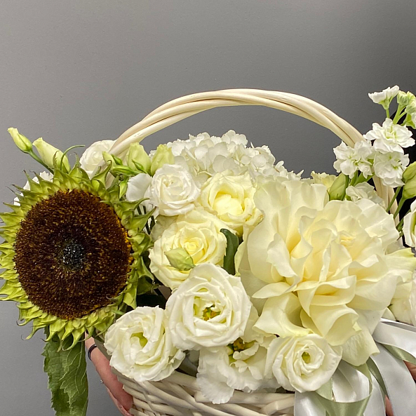 Корзина с цветами. Гортензия Белая, Эустома Белая, Роза Французская "Мондиаль", Маттиола Белая, Роза "Вайт Найт", Подсолнух.