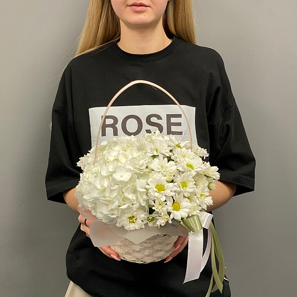 Корзина с цветами. Гортензия Белая, Хризантема Кустовая.