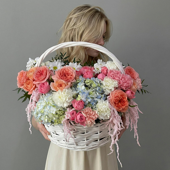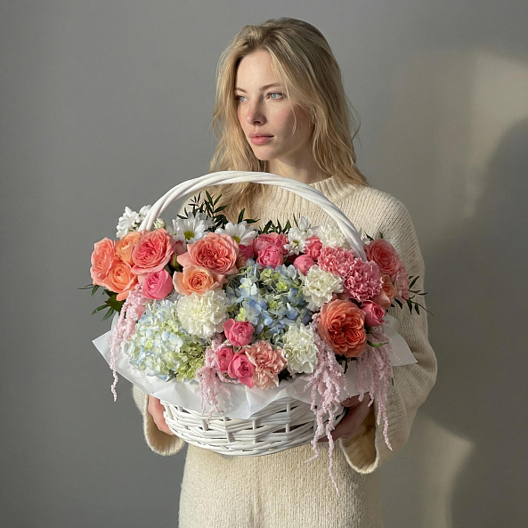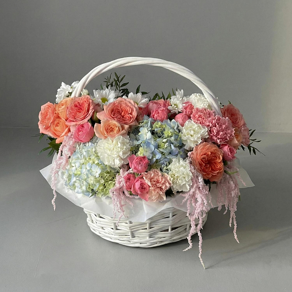 Корзина с цветами. Гортензия Голубая, Роза Кустовая Пионовидная "Пинк Дедикейшн", Роза Пионовидная "Лондон Ай", Хризантема Кустовая "Чик", Диантус (Гвоздика).