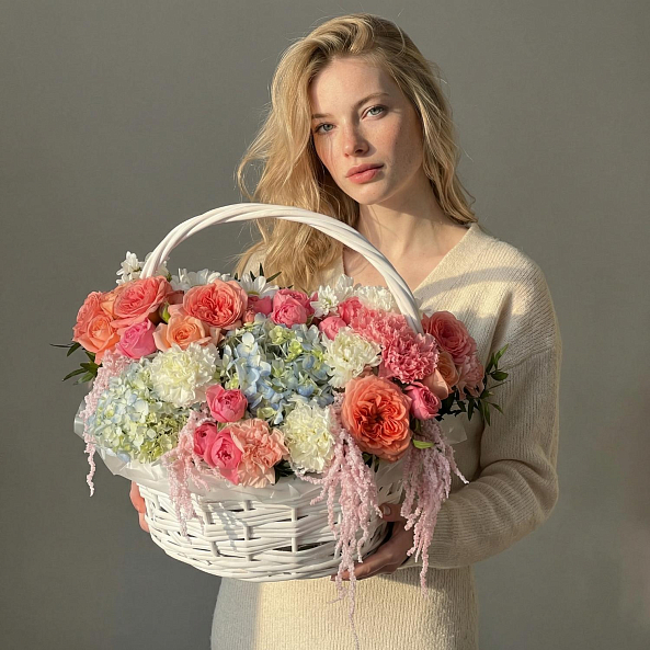 Представляем вам очаровательную и нежную корзину с цветами, созданную для тех, кто ценит изысканность и естественную красоту. Эта корзина — это не просто собрание цветов, а настоящий весенний сад, наполненный ароматом свежести и любви.