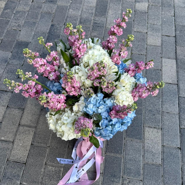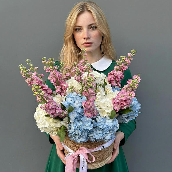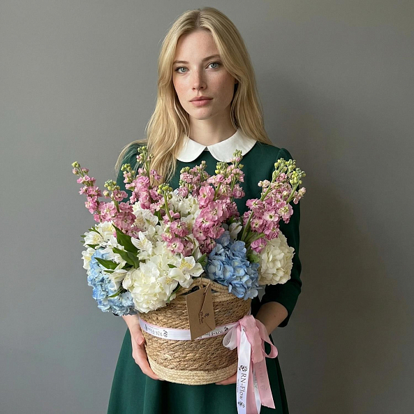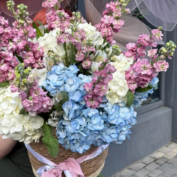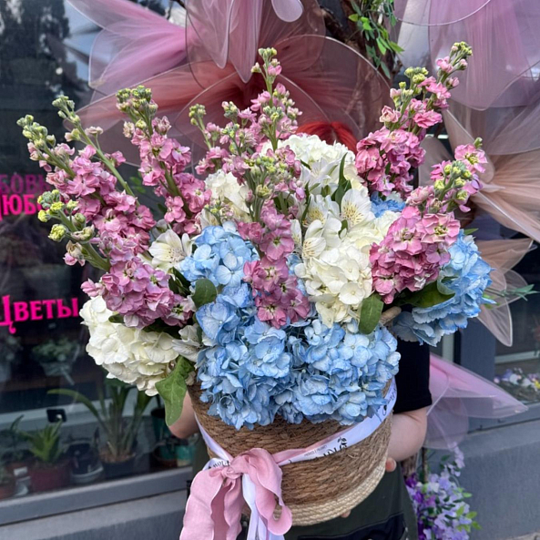 Корзина с цветами. Гортензия, Маттиола, Альстромерия.