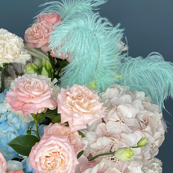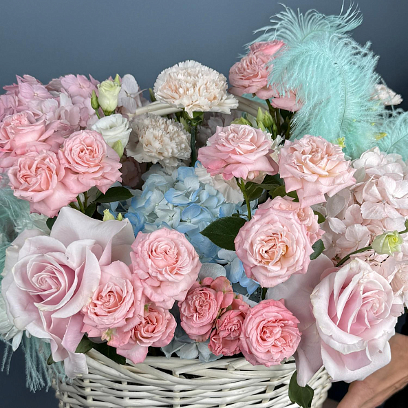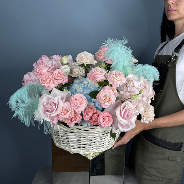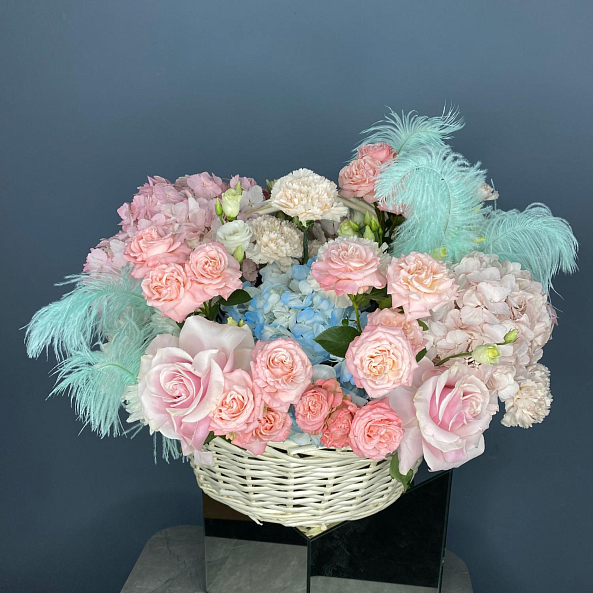 Корзина с цветами. Гортензия Нежно-Розовая, Гортензия Голубая, Роза "Пинк Мондиаль", Роза Кустовая "Мадам Бомбастик", Эустома "Белая", Хризантема кустовая "Алтай", Перья, Гвоздика (Диантус) Лимонная.
