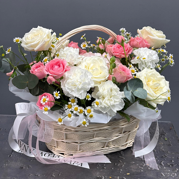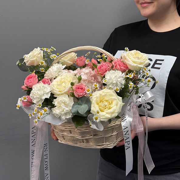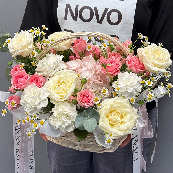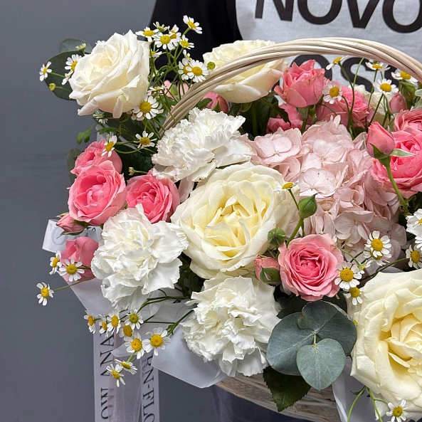 Корзина с цветами — розовая гортензия, французская роза "Мондиаль", кустовая пионовидная роза "Спешл Дайменшн", полевая ромашка и белая гвоздика (диантус) — это сочетание нежности, элегантности и свежести. Пышные и воздушные бутоны создают мягкий и трогательный образ, подчёркивающий изысканность и душевную теплоту. Такая корзина станет отличным подарком на день рождения, юбилей или как знак внимания и уважения.