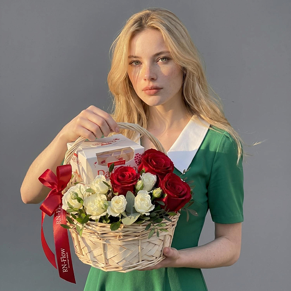 Этот изысканный подарок — настоящая симфония страсти и нежности, где премиум-розы «Эксплорер» в насыщенном багряном оттенке сливаются с пионовидными кустовыми розами «Вайт Пиони» в кремовом цвете, создавая гармоничную композицию в плетеной корзине с коробкой конфет Raffaello, словно застывший момент из самой романтической сказки. Каждый бутон, от бархатистых лепестков до свежих зеленых стеблей, дарит ощущение глубины чувств, а нежные конфеты с кокосовой начинкой добавляют сладкую нотку в композицию.