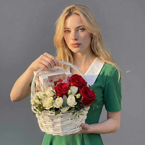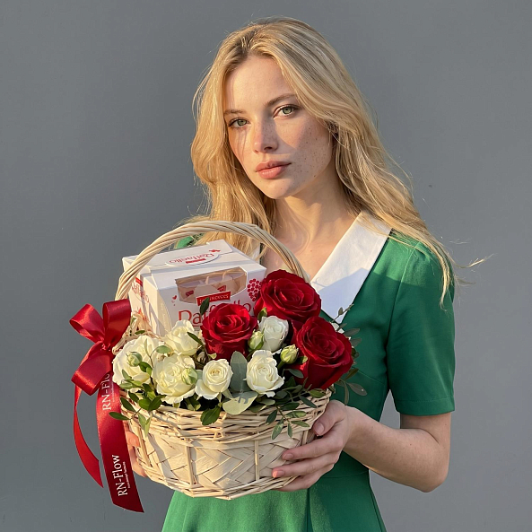 Корзина с Цветами и Конфетами. Роза Премиум "Эксплорер", Пионовидная Кустовая "Вайт Пиони".