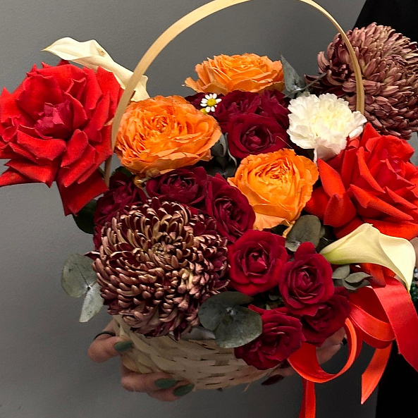 Корзина с цветами. Хризантема Бигуди, Пионовидная Роза "Оранж", Французская Роза "Нина", Кустовая Роза "Ред Дайменшн", Каллы, Гвоздика (Диантус).