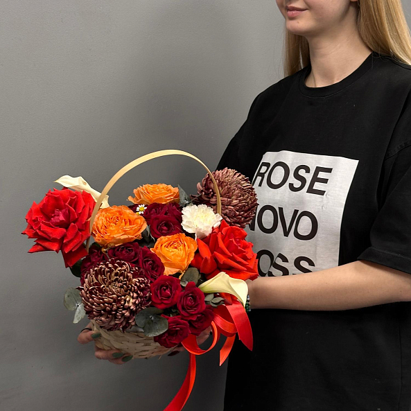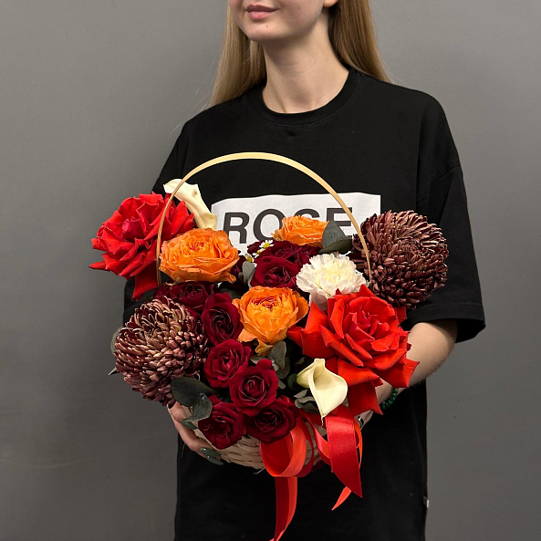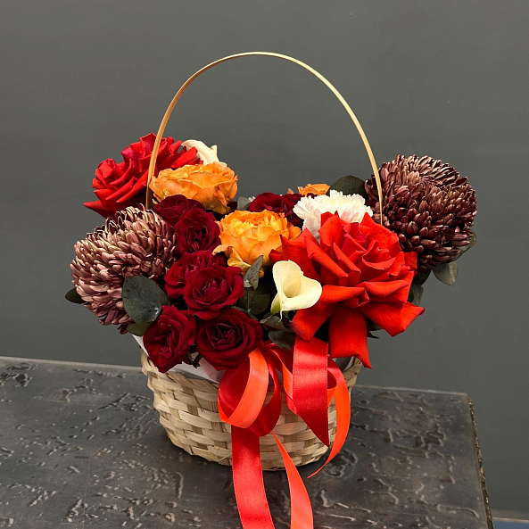Роскошная корзина с цветами, созданная в насыщенной красно-оранжевой гамме — символ страсти, энергии и праздника. Композиция объединяет пышную хризантему «Бигуди» с фактурными лепестками, нежную пионовидную розу «Оранж», глубокую французскую розу «Нина», яркую кустовую розу «Ред Дайменшн», элегантные белые каллы и ароматную гвоздику. Все цветы собраны в объемную, динамичную композицию в плетеной корзине, дополненной контрастной лентой. Идеальный выбор для торжественного подарка, который оставит яркое впечатление и подчеркнет ваше внимание к деталям.