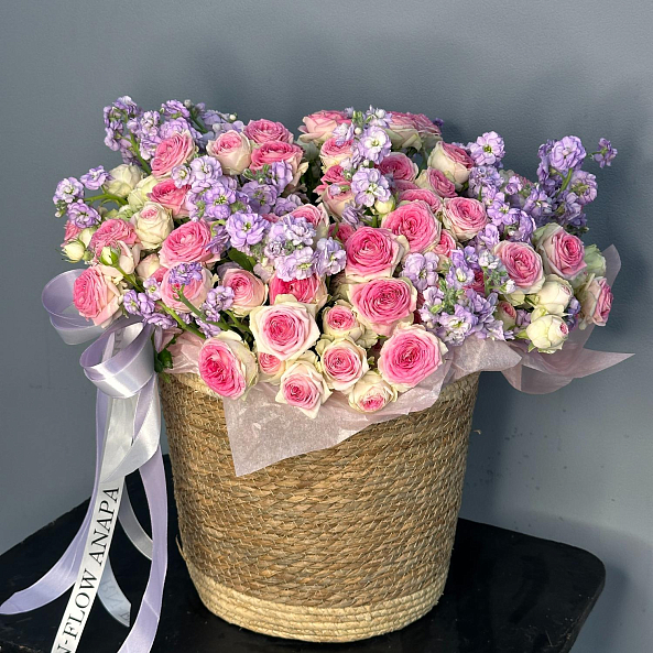 Корзина с цветами. Кустовая Пионовидная Роза "Джелато", Маттиола Лавандовая.