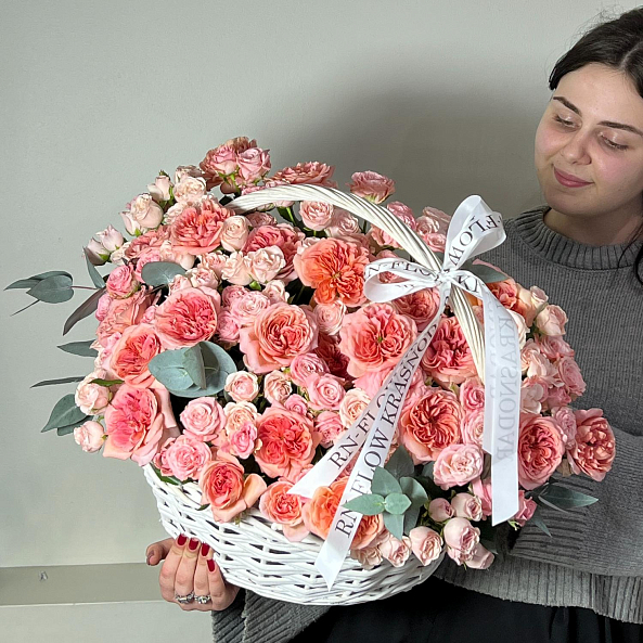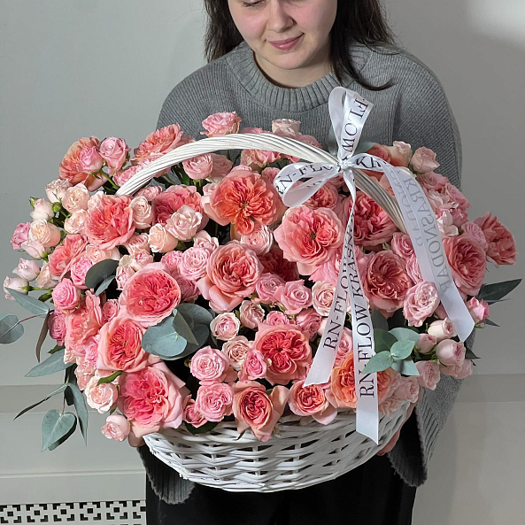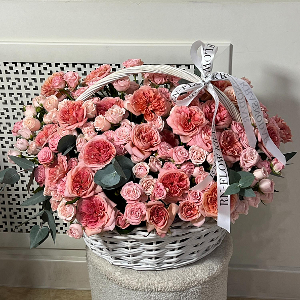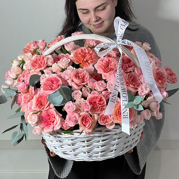 Корзина с цветами. Кустовая Пионовидная Роза "Мисс Пиони", Кустовая Кремовая Роза "Полина", Пионовидная Роза "Лондон Ай".