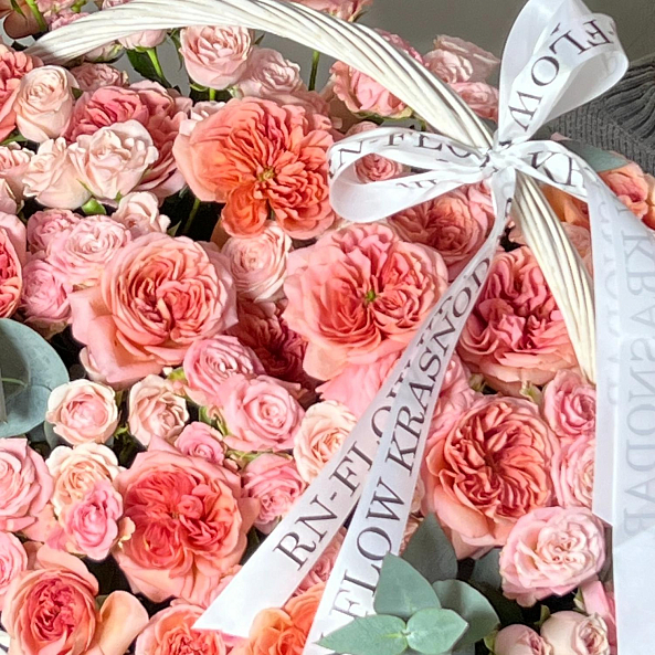 Пионовидные розы в оттенках персика и розового, украшенные эвкалиптом и лентой с вашим логотипом. Идеально для Дня матери, 8 марта, Дня рождения или просто так — чтобы порадовать.