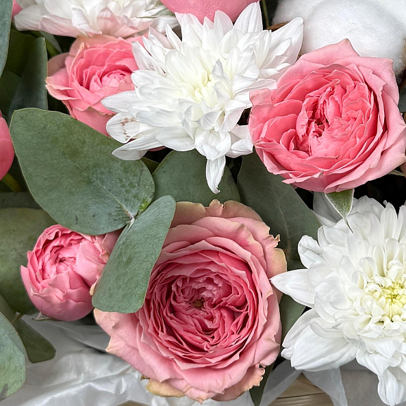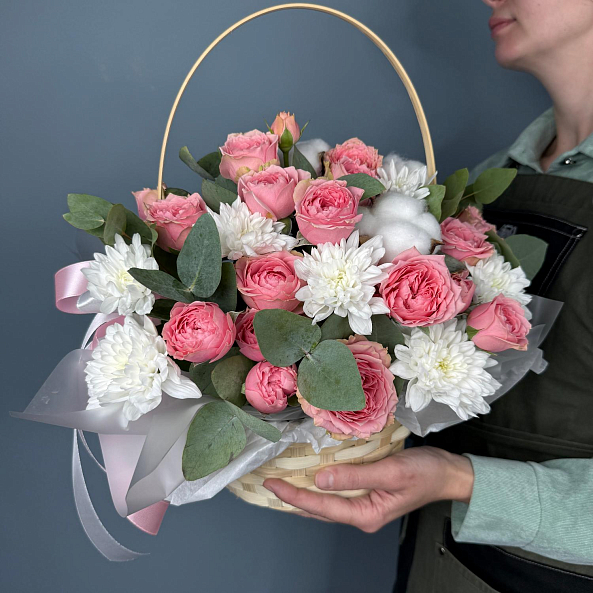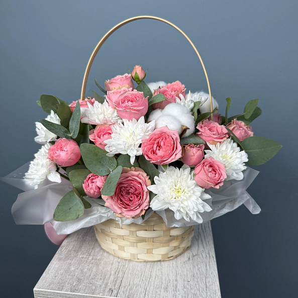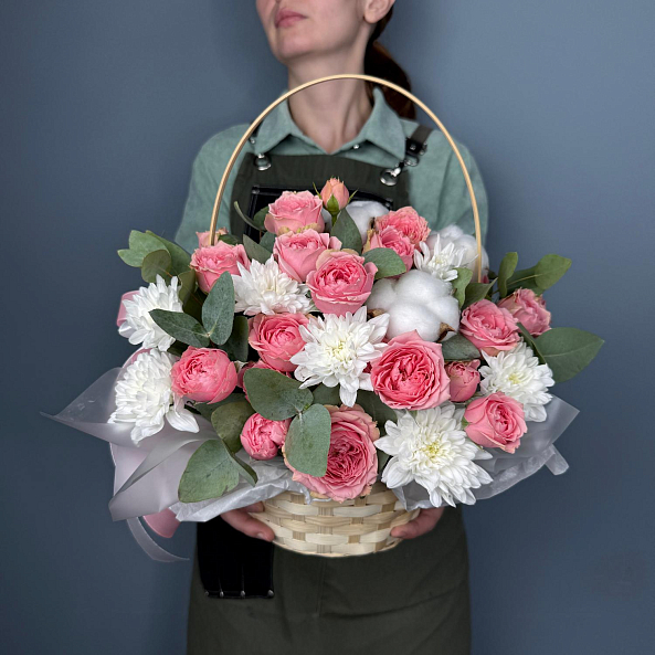 Корзина с цветами. Кустовая Пионовидная Роза "Спешл дайменшн", Хризантема Кустовая "Алтай", Хлопок, Эвкалипт.