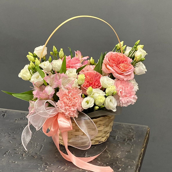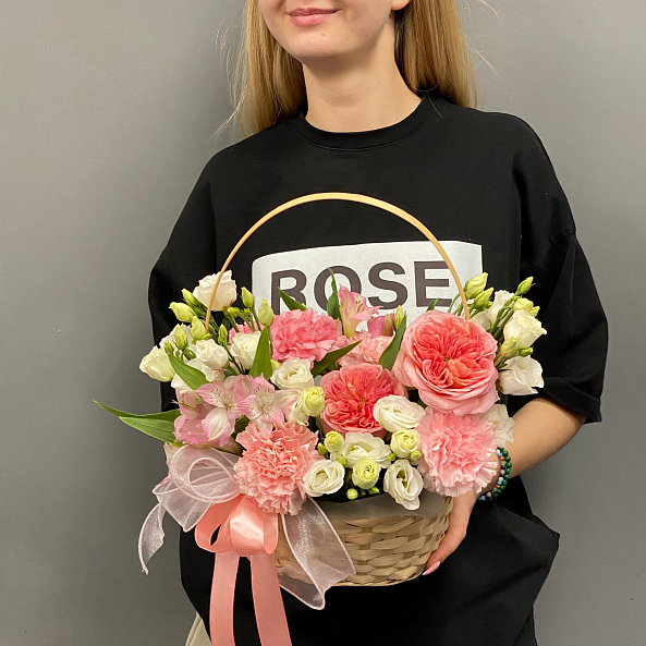 Корзина с цветами. Пионовидная Роза, Эустома Белая, Альстромерия Розовая, Гвоздика (Диантус) Розовая.