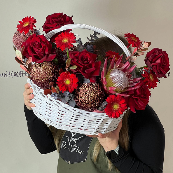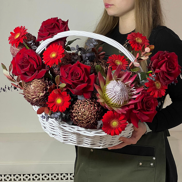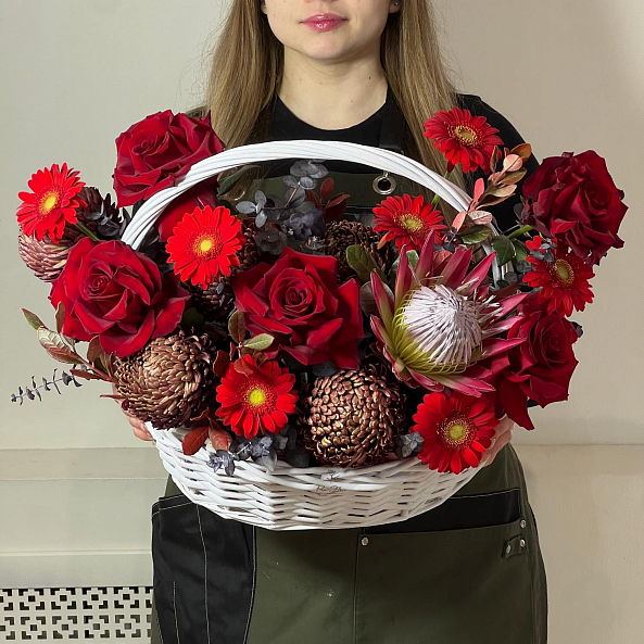 Роскошная корзина с пышным миксом красных роз, гербер и экзотической протеи. Глубокие оттенки и необычные формы цветов создают эффектное и запоминающееся сочетание — идеальный подарок для тех, кто ценит изысканность и смелость. Круглые шапочки хризантем бигуди - дополняют образ страсти. Отличное решение для подарка любимой, жене, девушке! Яркой персоне на день рождения или признания в любви.