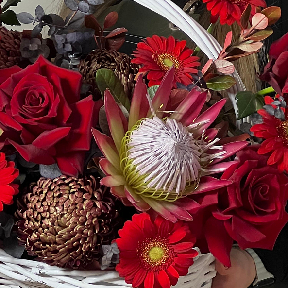 Корзина с цветами. Протея, Французская роза "Экспловер", Хризантема Одноголовая Бигуди, Гербера Красная, Эвкалипт Цинерия.