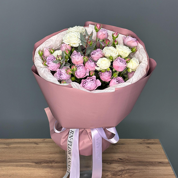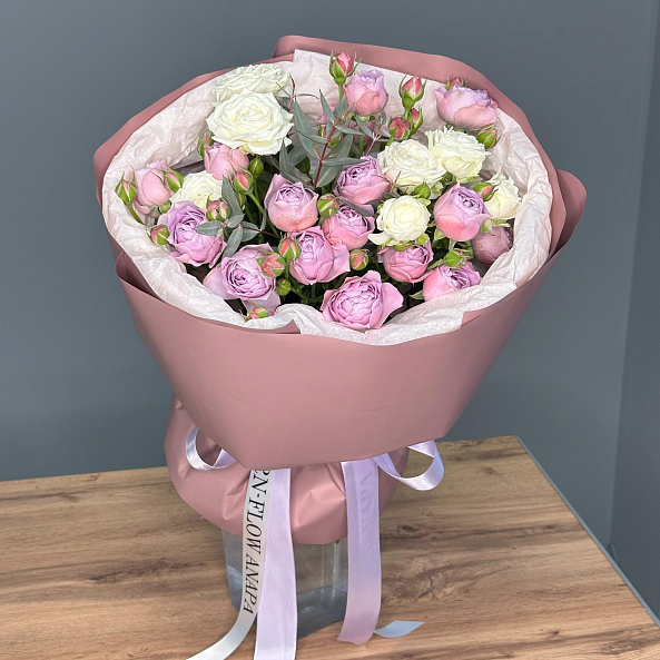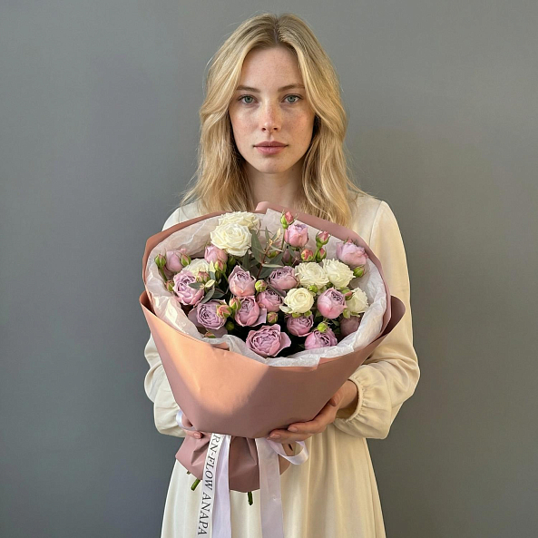 Этот букет — нежный танец оттенков, где кремовые и розовые кустовые розы сливаются в плавный вальс чувств. Пышные бутоны, словно окутанные утренним туманом, переливаются от нежного персика до глубокого розового, создавая ощущение тепла и уюта. Свежие веточки эвкалипта придают композиции естественную легкость, а аккуратная розовая упаковка с атласной лентой завершает образ изысканной простотой.