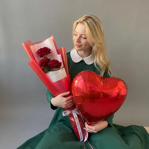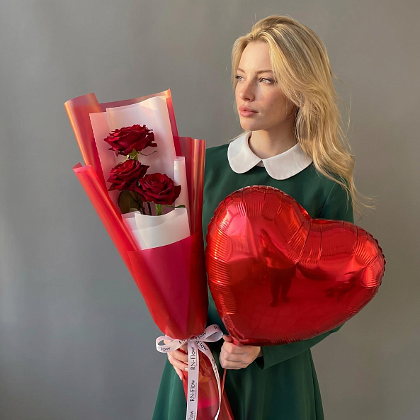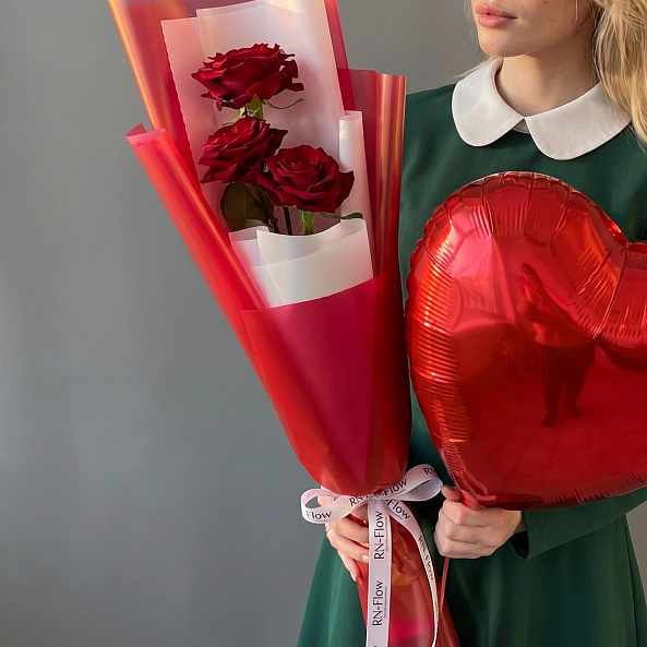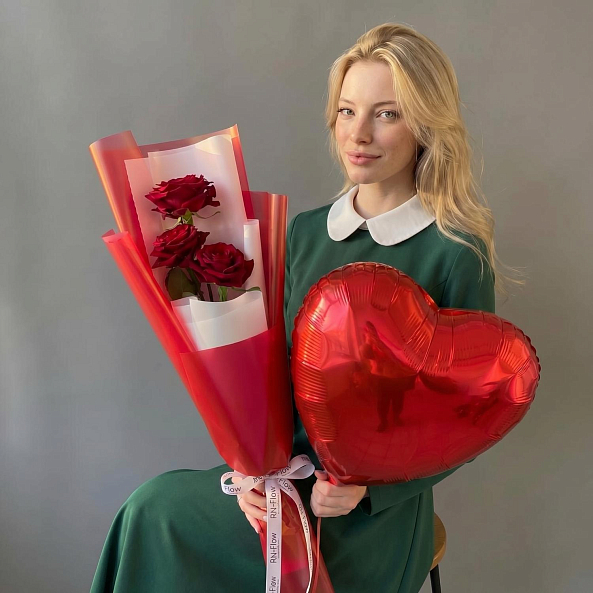 Набор «Комплимент: 3 Розы «Ред Наоми» 70 см и Шар Сердце»