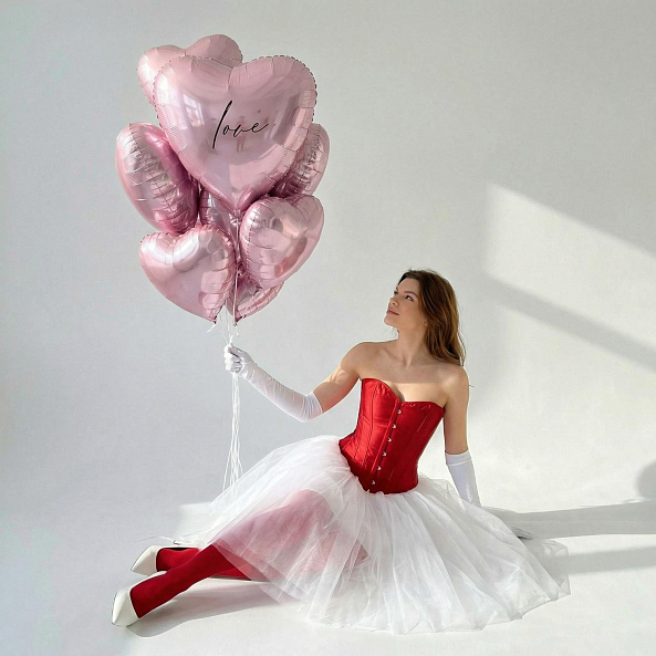 Погрузитесь в атмосферу нежной страсти с этим очаровательным набором из розовых фольгированных сердец! Каждое сердце, покрытое мягким металлическим блеском, словно окутано утренним светом, а центральный шар с изысканной надписью «love» вручает вашим чувствам самое трогательное послание. Их пастельный оттенок и глянцевая текстура создают ощущение, будто вы держите в руках кусочек неба, где любовь — главный закон.