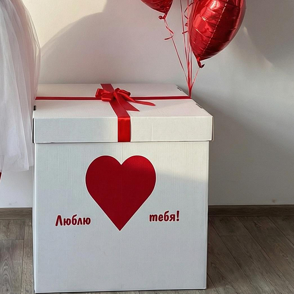 Этот уникальный набор — идеальный сюрприз для тех, кто ценит смелые и трогательные жесты. Белоснежная подарочная коробка с ярким красным сердцем и нежной надписью «Люблю тебя!» сочетается с пышной композицией из блестящих красных шаров-сердец, создавая атмосферу тепла и близости.
