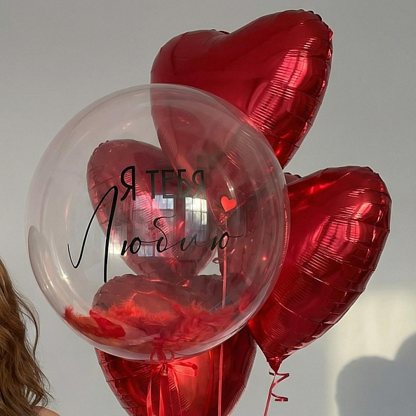 Этот очаровательный набор воздушных шаров станет идеальным способом выразить ваши чувства. Прозрачный шар с изысканной надписью «Я тебя люблю» и нежным сердечком в центре дополняет пышная композиция из блестящих красных сердец, создающая атмосферу нежности и страсти.