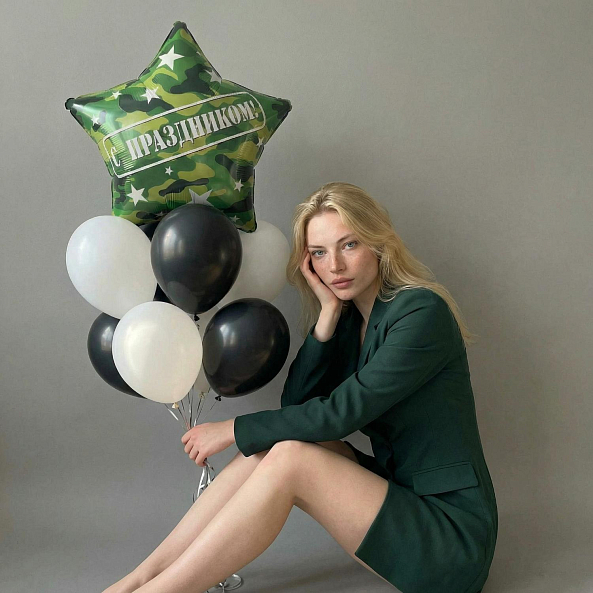 Яркая композиция, которая подчеркнёт любой праздник! Центральный шар-звезда в камуфляжном дизайне с надписью «С праздником!» гармонично сочетается с элегантными черно-белыми шарами, создавая стильный и современный образ. Наполненные гелием, шары легко парят в воздухе, а прочный фольговый материал сохраняет форму и яркость до 14 дней — идеально для торжества как в офисе, так и дома. Для мужчин