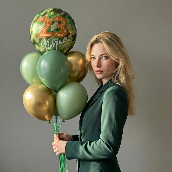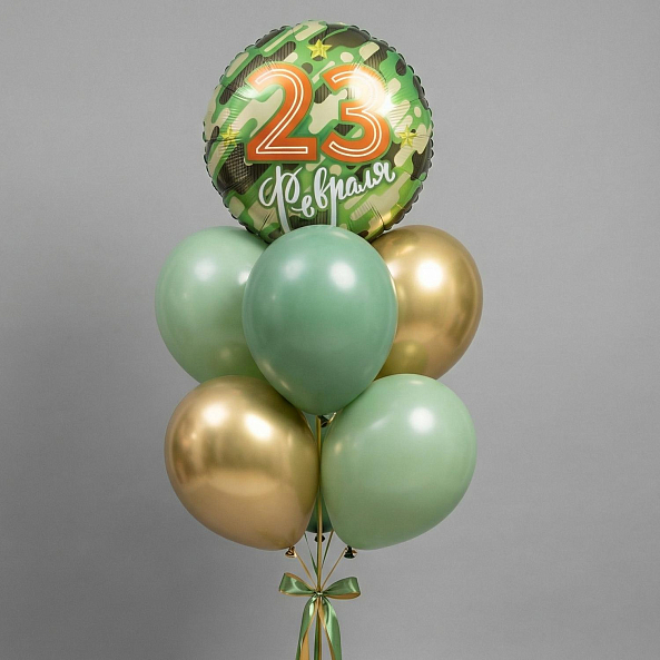 Яркая композиция, которая подчеркнёт мужественность и статус «героя»! Центральный шар с надписью «23 февраля» в камуфляжном дизайне гармонично сочетается с золотыми и нежно-зелёными шарами, создавая патриотичный и современный образ. Для Мужчин