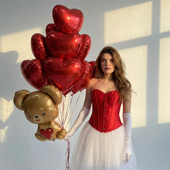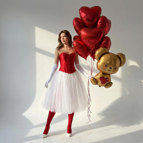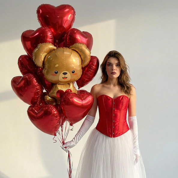 Создайте атмосферу нежности и тепла с этим очаровательным набором воздушных шаров! Яркие красные сердца и милый золотой медвежонок-шар в руках вашей избранницы станут идеальным акцентом для романтического вечера, дня святого Валентина или особого торжества. Каждая деталь — от блестящего шелка корсета до нежного фатина юбки — подчеркивает изысканность момента. Подарите близкому человеку ощущение сказки, где «Будь у меня 100 жизней, я бы каждую прожил с тобой» — это не просто слова, а обещание, воплощенное в каждом мгновении.