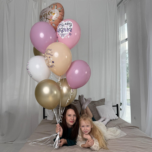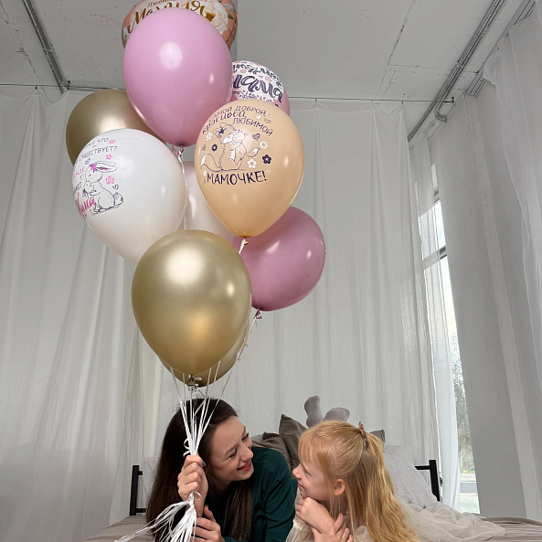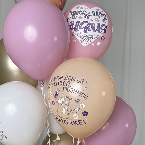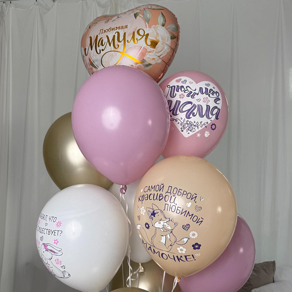 Нежный и трогательный набор шаров в пастельной палитре — идеальный подарок для любимой мамы. В комплекте большие шары с нежными надписями «Любимая Мамуля» и «Мамочка!», украшенные цветочными мотивами, и блестящие золотые шарики. Создайте атмосферу праздника и тепла, порадовав маму самым искренним сюрпризом.