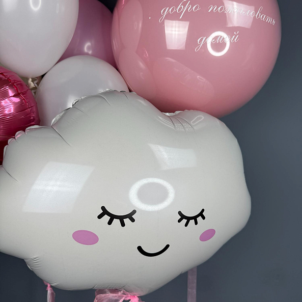 Набор шаров на выписку — трогательный и яркий сюрприз для новорождённой! В комплекте: нежные розовые, белые и перламутровые шары, два сердечка-шара, облако с милым лицом и большой персонализированный шар с надписью (ОНА МОЖЕТ БЫТЬ ЛЮБАЯ) . Идеально подойдёт для встречи малыша дома. Надут гелием — легко парит, создавая праздничное настроение.