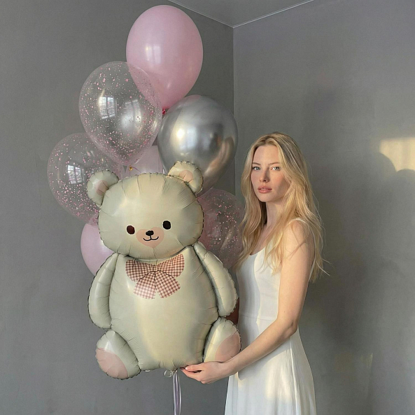 Погрузитесь в мир уюта и волшебства с этим очаровательным набором, где гигантский фольгированный медвежонок в нежных оттенках крема становится центром внимания! Его окружают пышные розовые и серебристые латексные шары, некоторые с мерцающим конфетти, создавая атмосферу, словно вы держите в руках кусочек сказочного праздника. Медвежонок с милым клетчатым бантиком и улыбкой, которая тает сердце, добавляет игривости, а плавный переход от розового к серебру — изысканности.