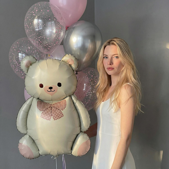 Шар фольгированный, Сатин Мишка кремовый с бантиком 87 см — 1 штука