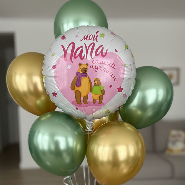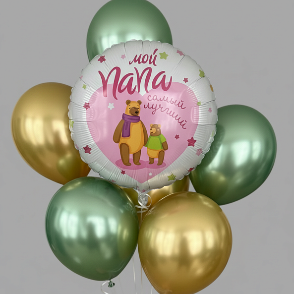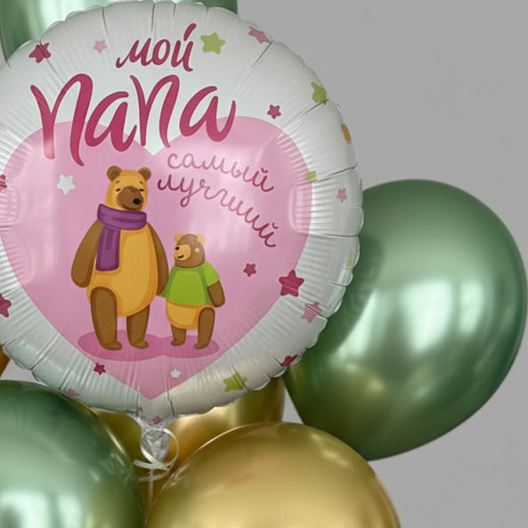 Нежный и трогательный набор с фольгированным шаром в форме сердца и милыми мишками — идеальный подарок от маленького сына или дочки. Золотые и зелёные латексные шары добавят праздничного блеска. Подарите папе улыбку — он точно оценит вашу любовь!