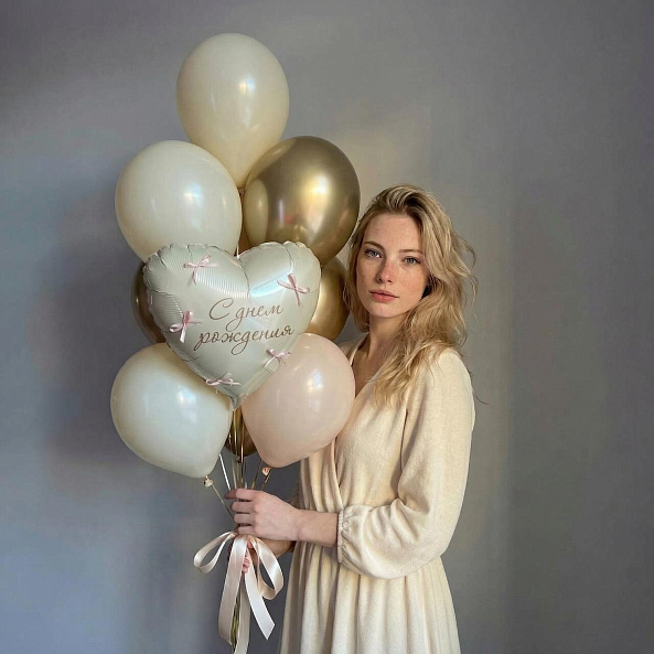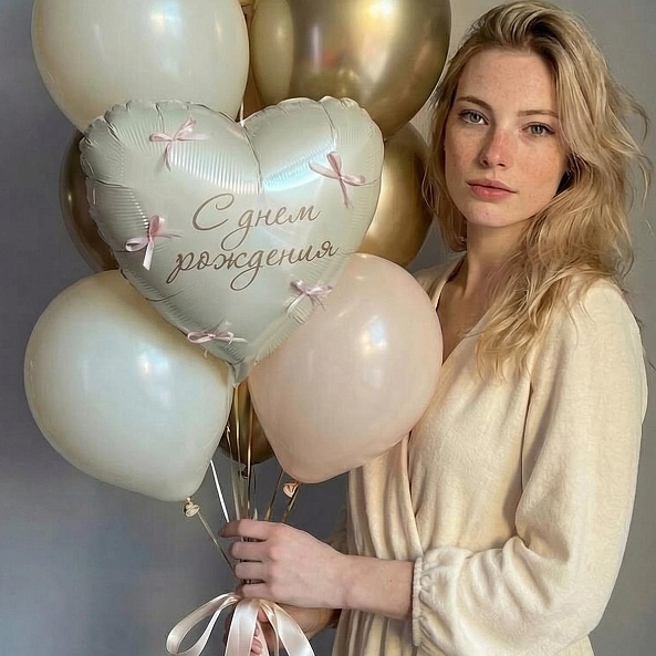 Этот уникальный набор из 9 шаров — настоящий гимн празднику, где каждая деталь создает атмосферу тепла и элегантности. Центральным элементом станет сердце с надписью «С днём рождения», украшенное нежными розовыми бантиками, словно застывший волшебный момент.
