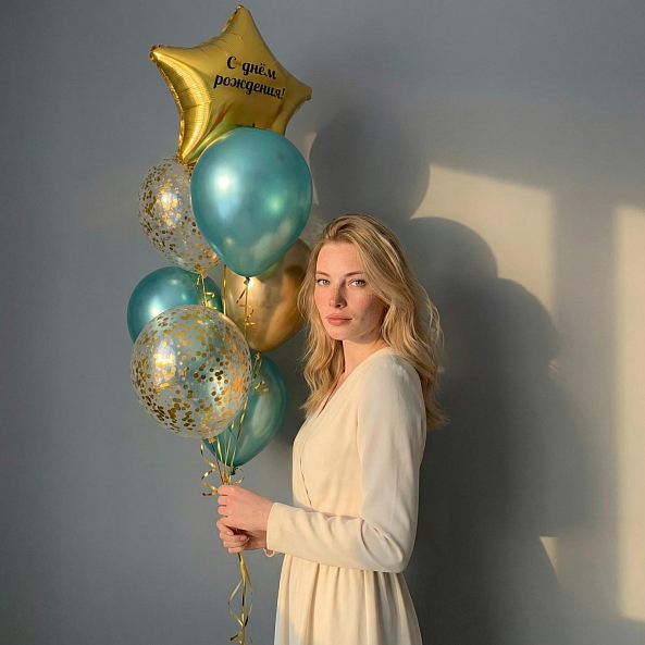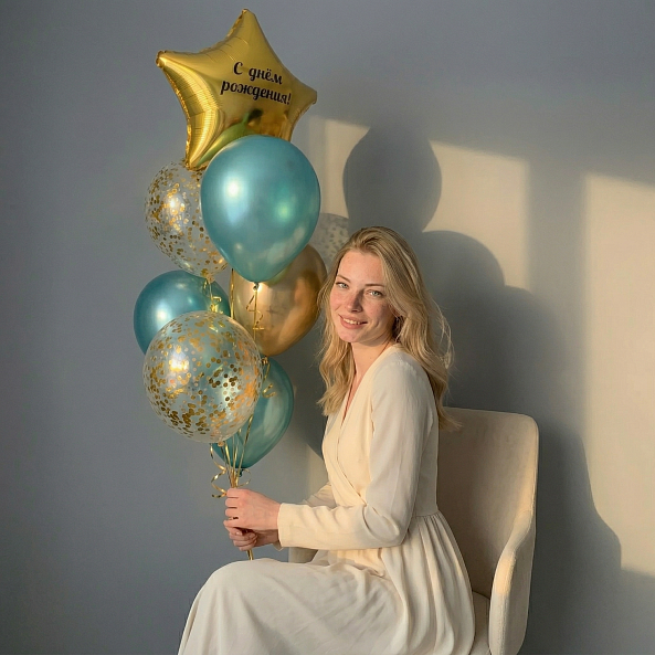 Этот изысканный набор — настоящая симфония торжества, где голубые шары с золотым конфетти и золотая звезда с надписью «С днём рождения!» сливаются в единый волшебный образ. Каждый элемент, от сияющего золотого шара до нежных голубых акцентов, словно застывший волшебный момент из праздничной сказки.