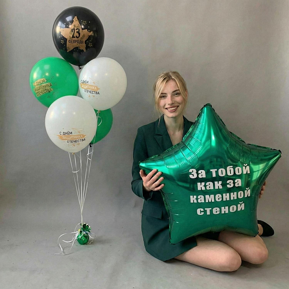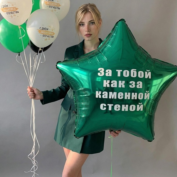 Этот уникальный набор фольговых шаров — не просто декор, а искреннее признание в благодарности и уважении. Центральный элемент — объемная зеленая звезда с надписью «За тобой как за каменной стеной», которая подчеркивает силу, надежность и безусловную поддержку. В комплекте — шары с поздравлениями «С Днём защитника Отечества» и «23 февраля», выполненные в элегантной зелено-белой палитре, символизирующей стабильность и честь. Наполненные гелием, шары легко парят в воздухе, а прочный фольговый материал гарантирует, что они сохранят форму и яркость до 2 недель — идеально для длительного празднования. папе, мужу, сыну, брату, мужчине