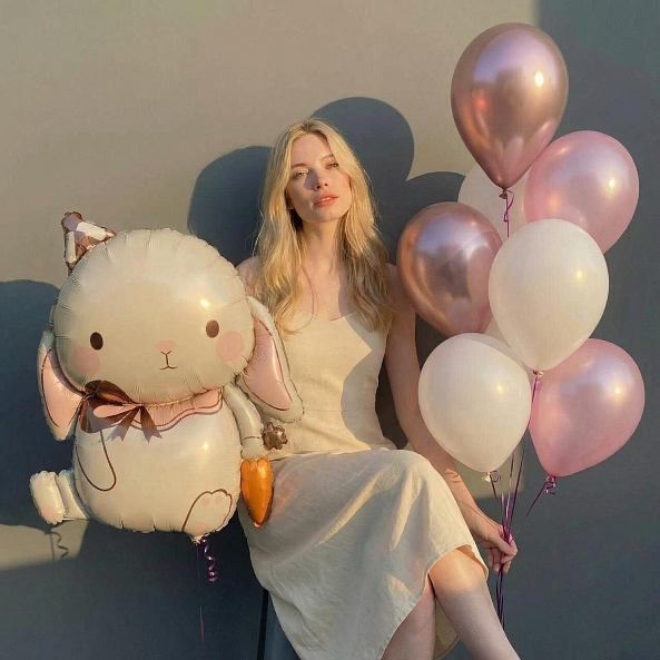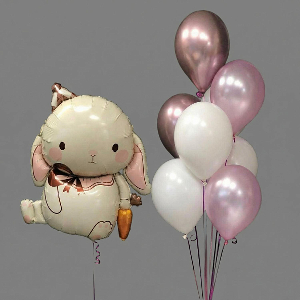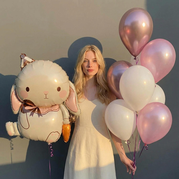 Этот очаровательный набор — настоящий символ праздника, где фольговый зайчик с розовыми щеками и набор воздушных шаров в розово-белой палитре сливаются в единую симфонию волшебства. Каждый элемент, от пухового зайчика с бантом до металлических розовых и белых шаров, словно застывший волшебный момент из детской сказки. Наполненные гелием, шары сохраняют форму и яркость до 2 недель, а аккуратные ленты с логотипом «RN-Flow» подчеркивают статус подарка.