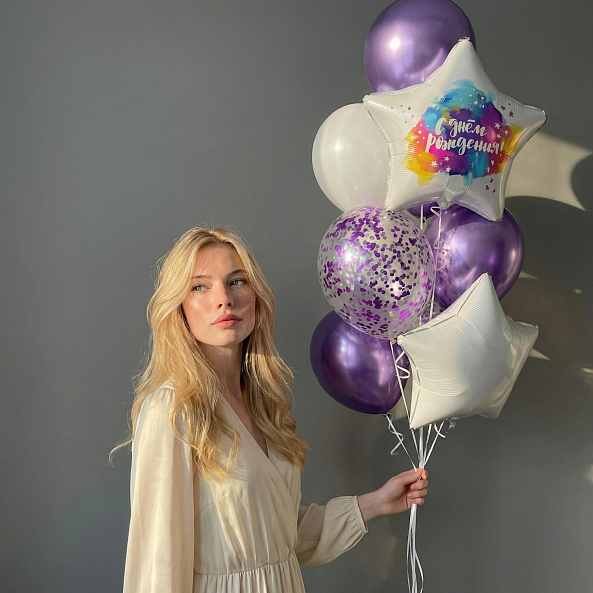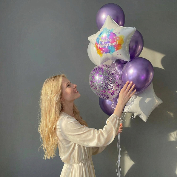 Этот изысканный набор — настоящая симфония праздника, где фиолетовые, белые и серебристые шары сливаются в единый волшебный образ. Центральным элементом станет звезда с надписью «С днём рождения!» в ярком акварельном стиле, дополненная блестящими шарами с фиолетовым конфетти и матовыми акцентами. Каждый элемент, словно застывший волшебный момент из сказки, создает атмосферу радости и элегантности