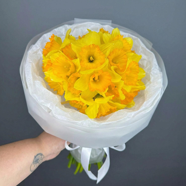 Этот яркий букет из желтых нарциссов — словно застывший луч весеннего солнца в ваших руках. Плотные соцветия с насыщенным золотистым оттенком и оранжевыми акцентами в центре дарят ощущение тепла и энергии, а длинные зеленые стебли придают композиции естественную грацию. Упакованный в нежную белую кальку с лентой «RN-Flow», букет выглядит лаконично и современно, идеально дополняя как повседневный образ, так и праздничное настроение.