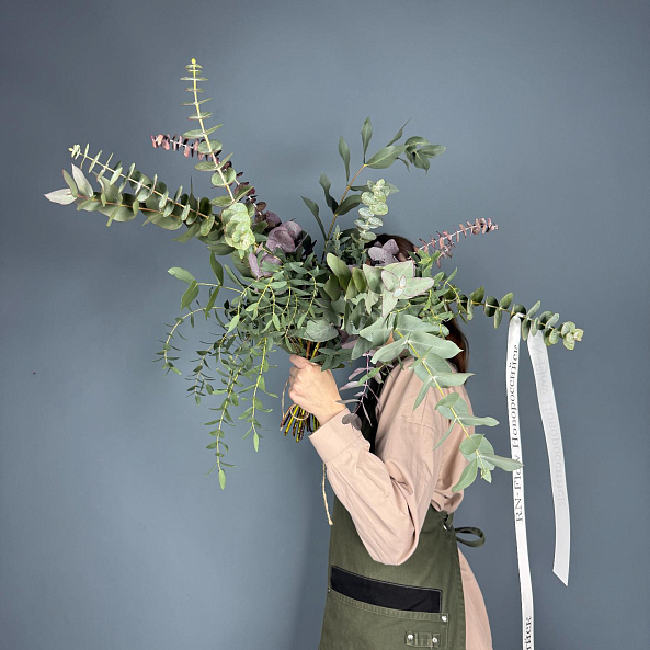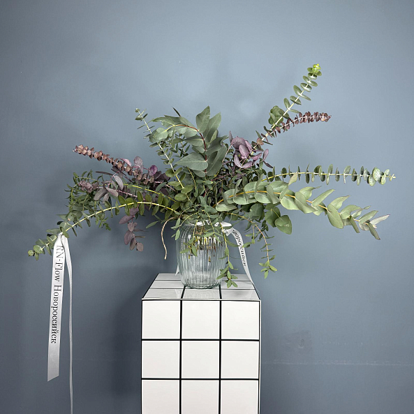 Натуральная, воздушная композиция из свежего эвкалипта с нежными серебристо-зелёными листьями и акцентами фиолетовой ветви. Идеальна как самостоятельный декор или для дополнения букетов — создаёт атмосферу спокойствия, уюта и природной гармонии.