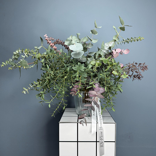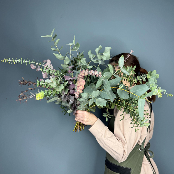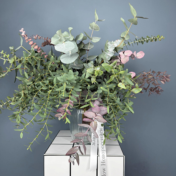 Натуральная, воздушная композиция из свежего эвкалипта с нежными серебристо-зелёными листьями и акцентами фиолетовой ветви. Идеальна как самостоятельный декор или для дополнения букетов — создаёт атмосферу спокойствия, уюта и природной гармонии.