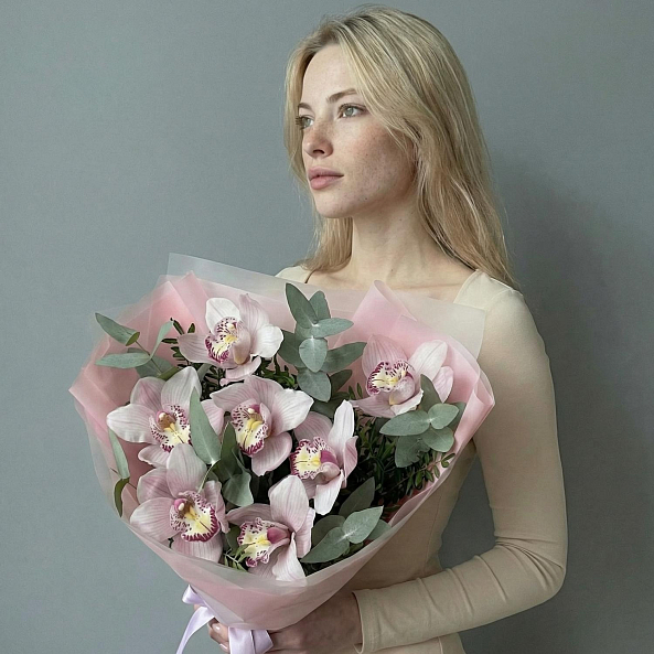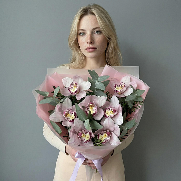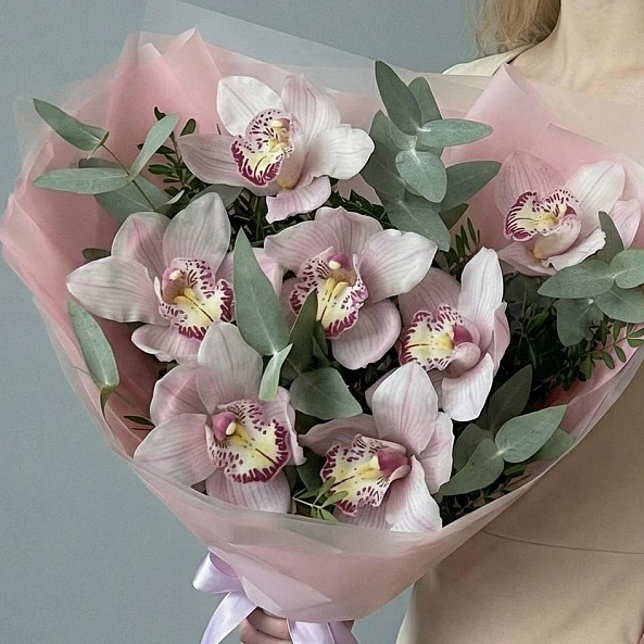 Экзотическая гармония, где изысканные орхидеи цимбидиум в нежно-розовых оттенках с фиолетовыми узорами в центре создают атмосферу утонченной роскоши. Каждый лепесток, словно расписанный художником, переливается мягким светом, а веточки эвкалипта добавляют свежести и естественной элегантности. Упакованный в прозрачную розовую кальку с атласной лентой, букет выглядит как живое произведение искусства, созданное для тех, кто ценит необычное и изысканное.