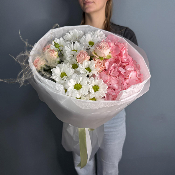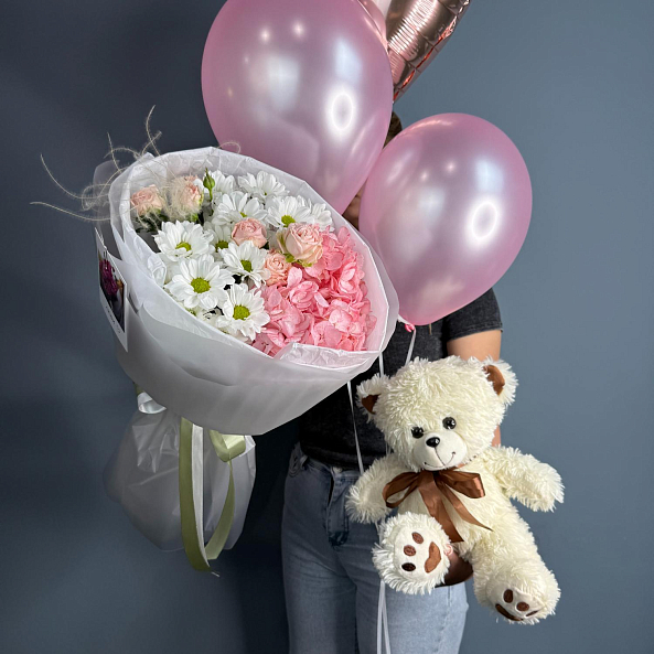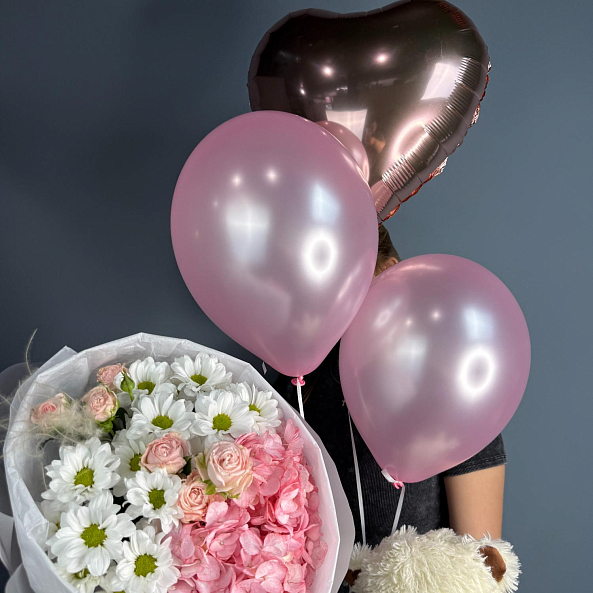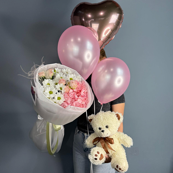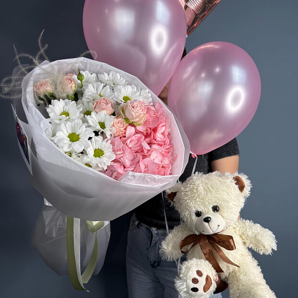 Нежный букет из белой хризантемы «Чик», пионовидной розы «Мадам Бомбастик» и нежно-розовой гортензии — идеальное сочетание чистоты, романтики и уюта. Упакован в прозрачную бумагу с зелёной лентой. В комплекте — шар сердце из розового золота, два перламутрово-розовых шара и мягкий мишка (цвет по наличию). Идеальный подарок для Дня рождения, свидания или как тёплое признание в любви.