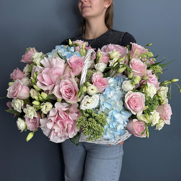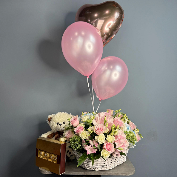 Элегантная корзина с цветами: розовая альстромерия, голубая гортензия, французская роза «Пинк Мондиаль», розовая роза «Пинк Атена», белая эустома, кустовая роза «Сноуфлейк» и свежий эвкалипт. В комплекте — шар сердце из розового золота, два перламутрово-розовых шара, мягкая игрушка 50 см (по наличию) и коробка конфет Ferrero Rocher. Идеальный подарок для Дня рождения, годовщины или романтического сюрприза.